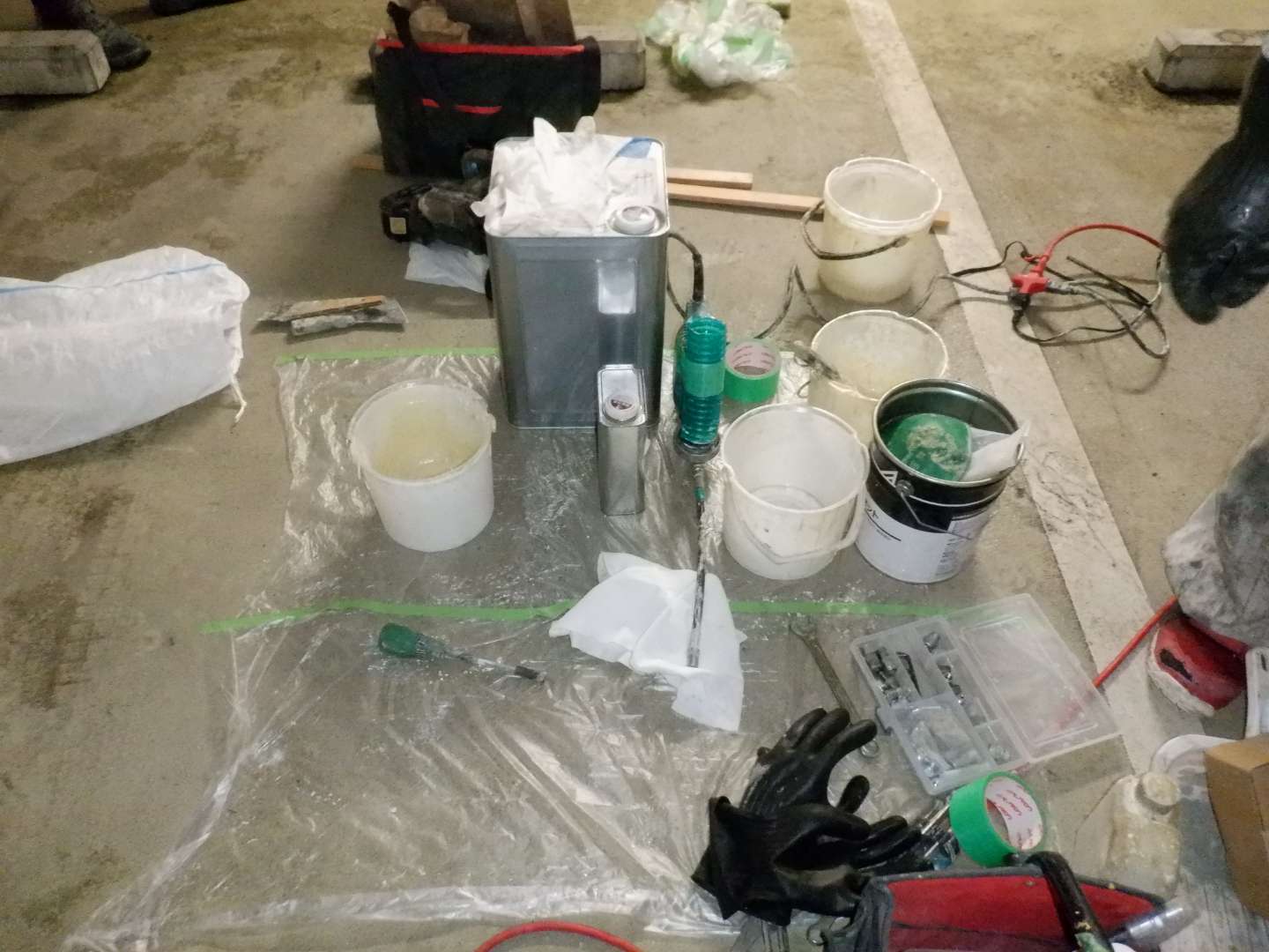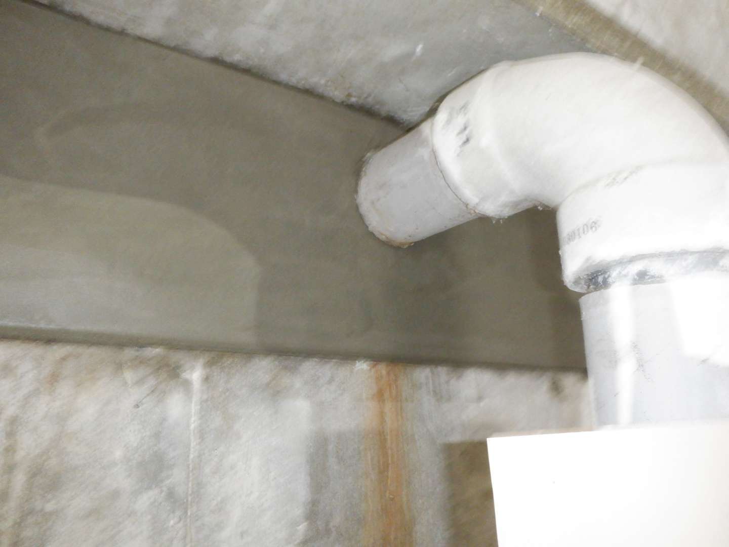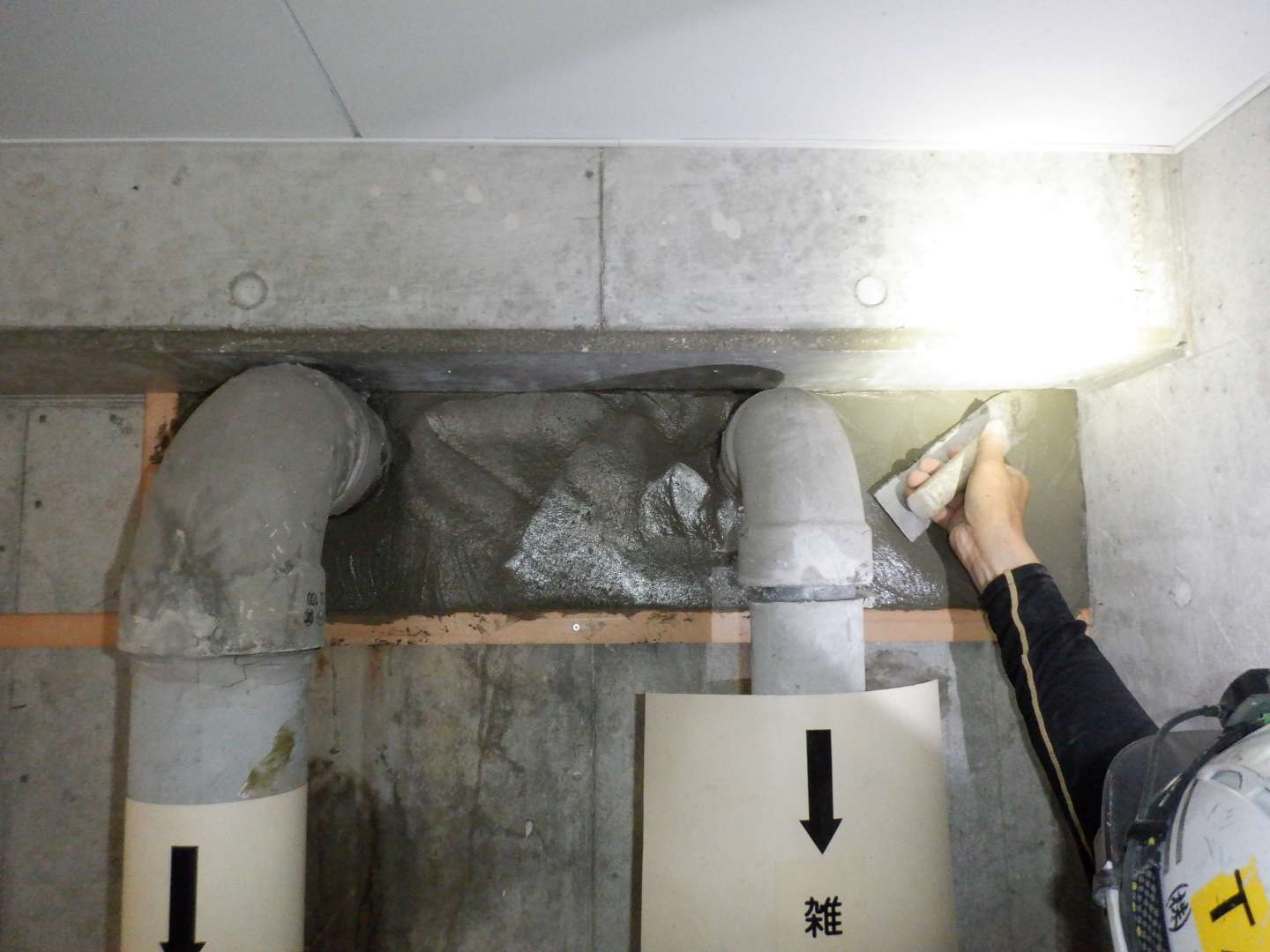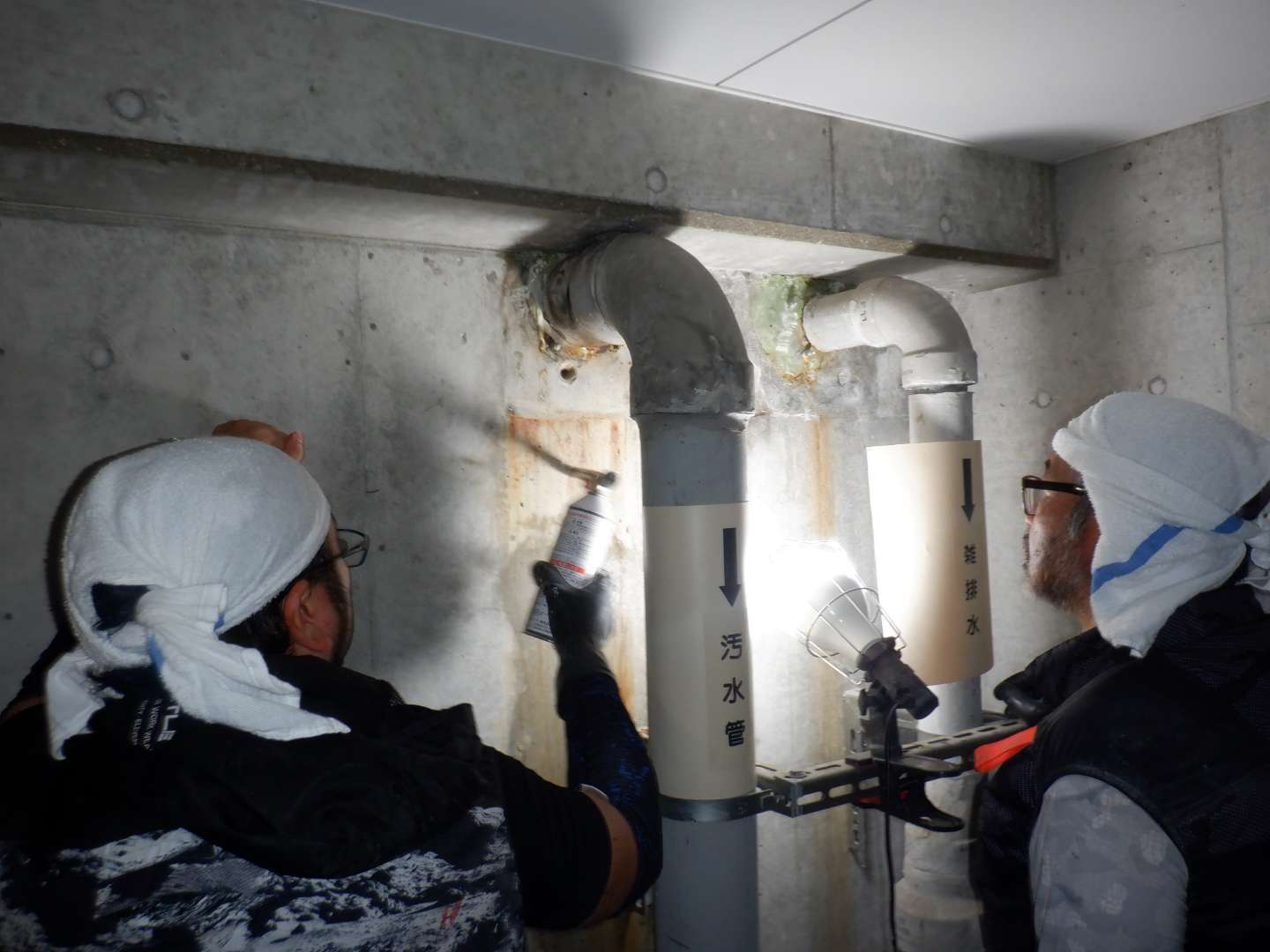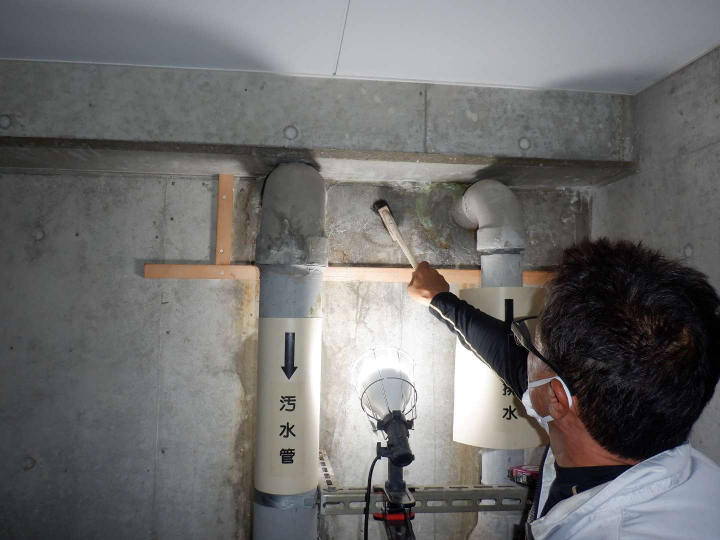 介護施設内2階洗面所からの排水が地下駐車場下の浄化槽に入る汚水管外側を伝い地下駐車場に漏れていた。汚水の漏水を止める為、水に反応すると硬化する薬液を注入し漏水を止めた。