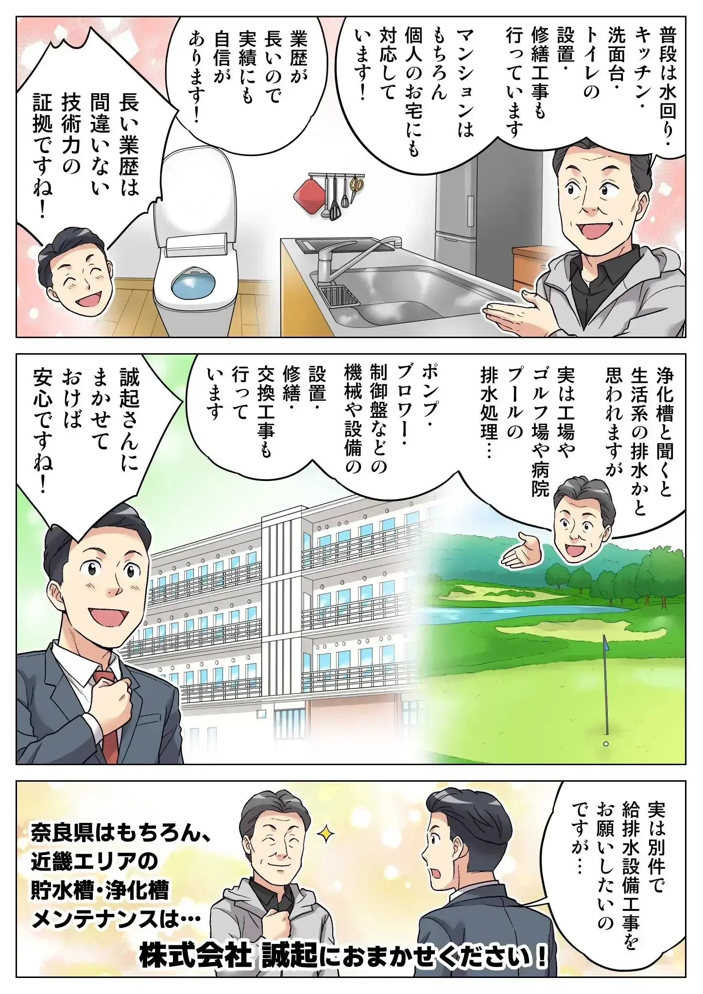誠起の関連会社「サンワテクノス」は、浄化槽などの排水処理設備の設計から対応しています。そのため、誠起へのご依頼も設計からご相談いただけます。